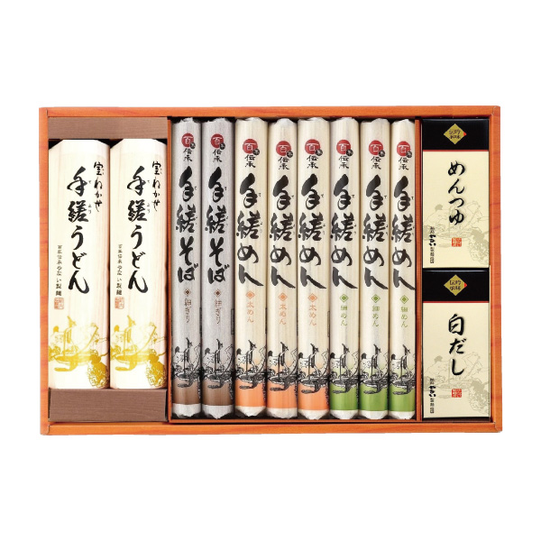 手縒めん(細めん・太めん)各180g×3、手縒そば180g・手縒うどん160g×各2、めんつゆ・白だしつゆ各30ml×3