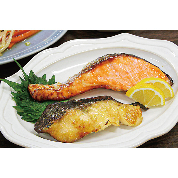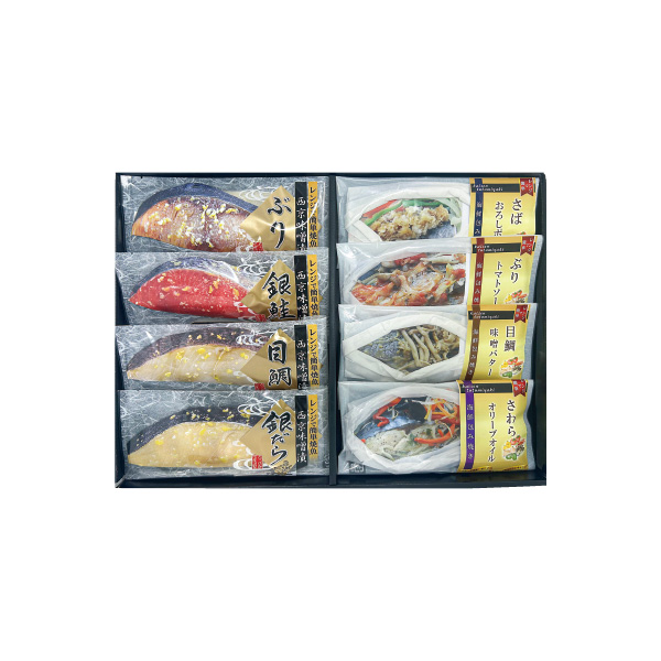 西京漬け(銀鱈・ぶり・銀鮭・目鯛)各70g、包み焼(さわらオリーブ・ぶりトマトソース・目鯛味噌バター)各110g、さばおろしポン酢包み焼125g