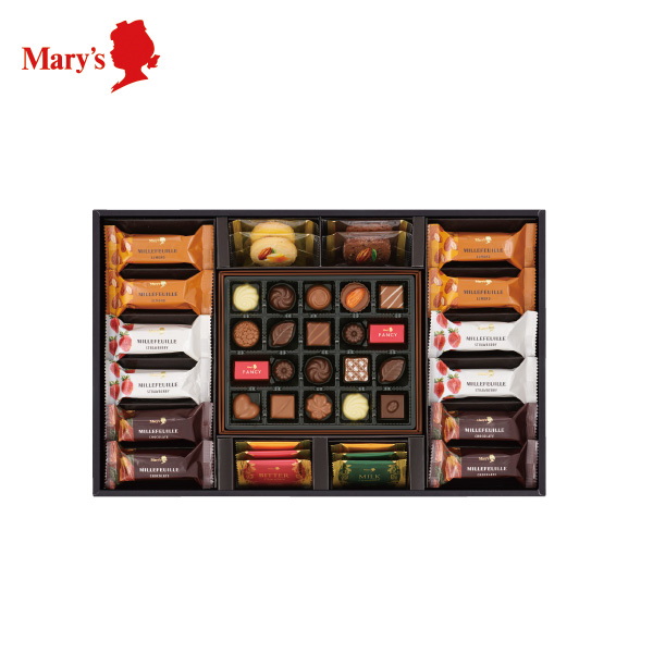 ファンシーチョコレート×20、ミルフィーユ(アーモンド・ストロベリー・チョコレート×各4)、プレーンチョコレート(ミルク・スイート・ビター×各2)、カカオサブレアソート×4 賞味期限120日