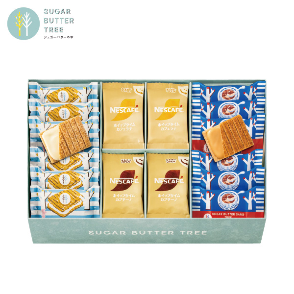 シュガーバターサンドの木×14、シュガーバターサンドの木 キャラメルブリュレ×14、ネスカフェホイップタイム(カフェラテ・カプチーノ×各10) 賞味期限120日