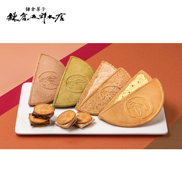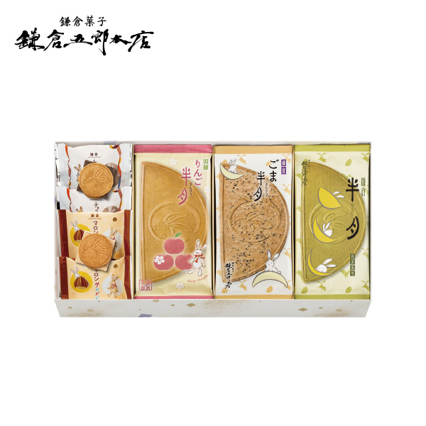 鎌倉半月(抹茶風味×2・小倉風味×3)、ごま半月・りんご半月×各5、鎌倉チョコサンドだょ・鎌倉マロンサンドだょ×各3 賞味期限90日