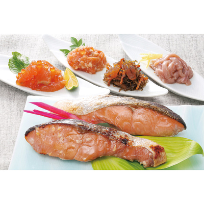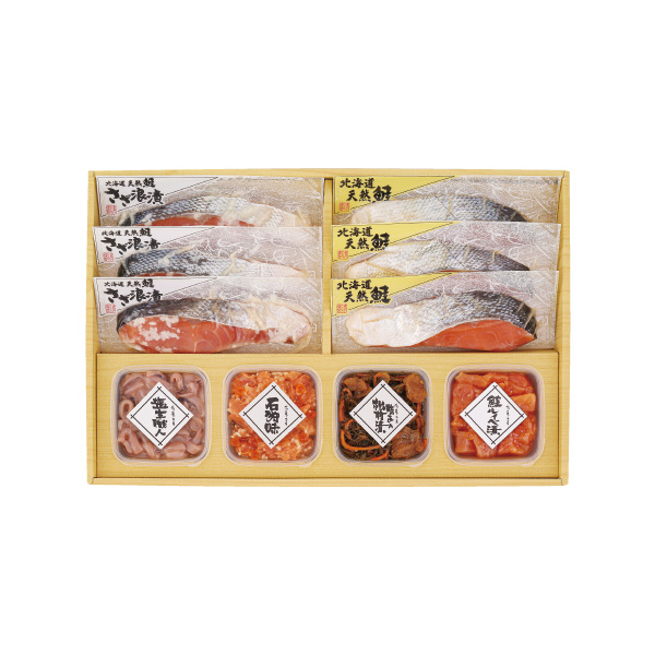鮭塩切身・鮭さざ浪漬×各3、鮭ルイベ漬・数の子入松前漬・塩辛職人・石狩味 各60g