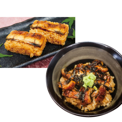 うなぎめし50g×4、粉山椒、おひつまぶしセット(刻みうなぎ35g、たれ15ml、濃縮だし10g、わさび、刻み海苔)×2