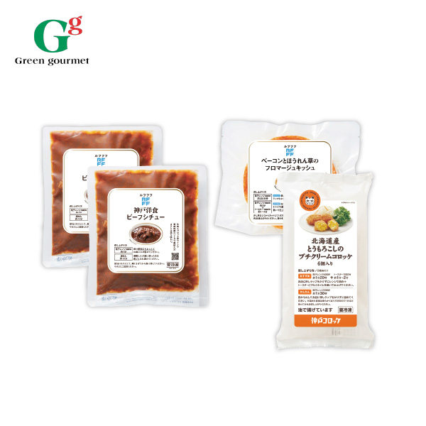 神戸洋食 ビーフシチュー 180g×2、ベーコンとほうれん草のフロマージュキッシュ160g、北海道産とうもろこしのプチクリームコロッケ 6個入り180g