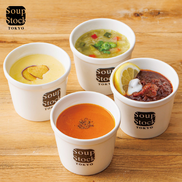 オマール海老のビスク・東京ボルシチ・とうもろこしとさつま芋のスープ・焼き鯛だしの和風スープ・緑の野菜のミネストローネ・イタリア産完熟トマトのクリームポタージュ・塩糀と生姜のチャウダー 各180g