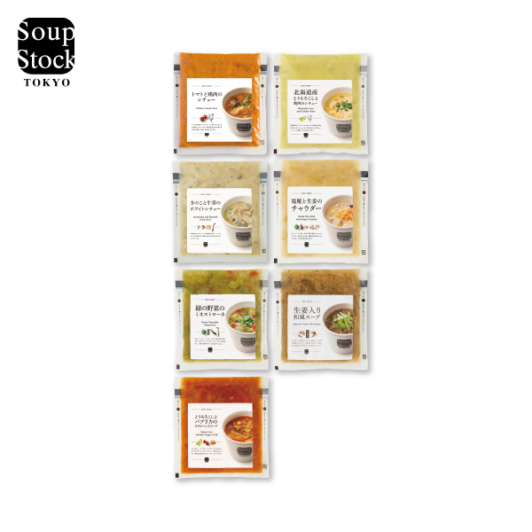 トマトと鶏肉のシチュー・北海道産とうもろこしと鶏肉のシチュー・きのこと牛蒡のホワイトシチュー・塩麹と生姜のチャウダー・緑の野菜のミネストローネ・生姜入和風スープ・とうもろこしとパプリカのチリビーンズ 各180g