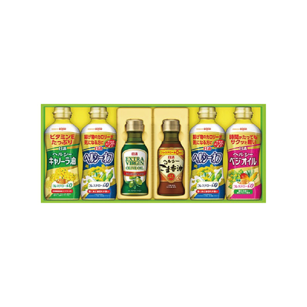 日清ヘルシーオフ×2・日清ヘルシーキャノーラ油・日清ヘルシーベジオイル 各350g、日清EXVオリーブオイル・日清ヘルシーごま香油 各145g